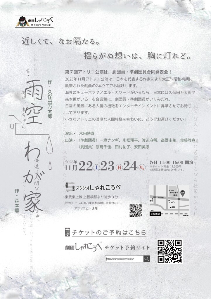 日本を代表する作家により大正〜昭和初期に執筆された戯曲の2本立てでお届けします。 海外にチェーホフやノエル・カワードがいるなら、日本には久保田万太郎や森本薫がいる!を合言葉に、劇団員・準劇団員がいりみだれ、 日常の風景にある人情の機微をエンターテインメントに昇華させてお待ち しております。 小さなアトリエの濃厚な人間模様を味わいに、どうぞお運びください!